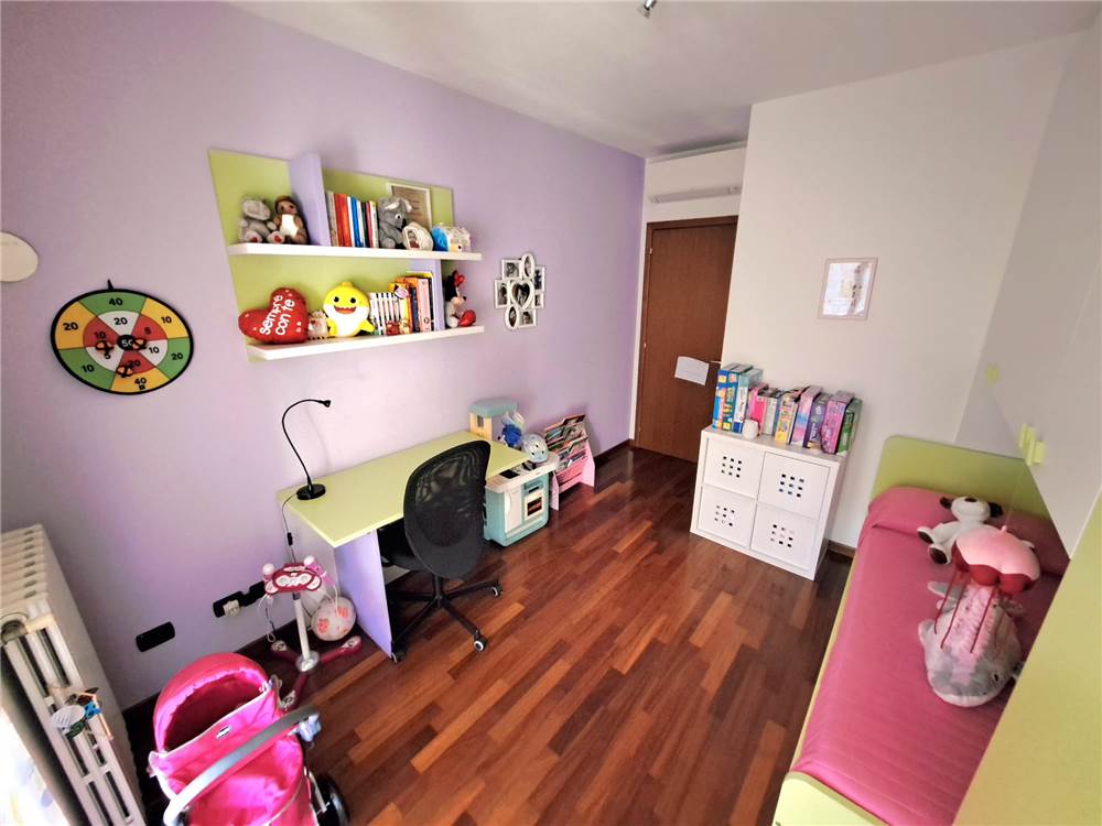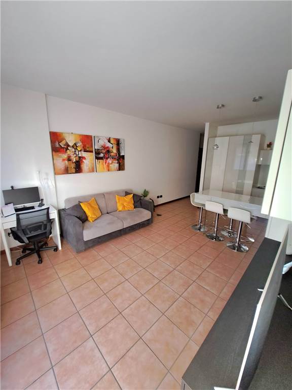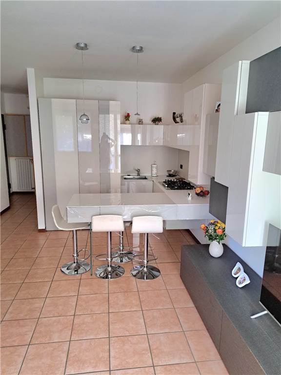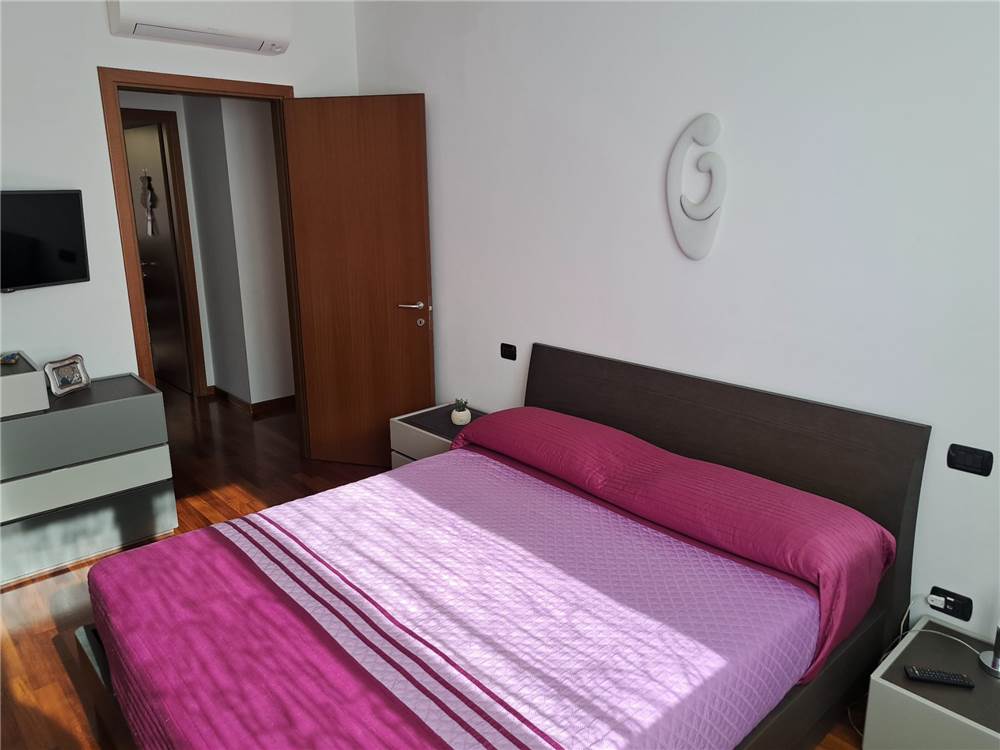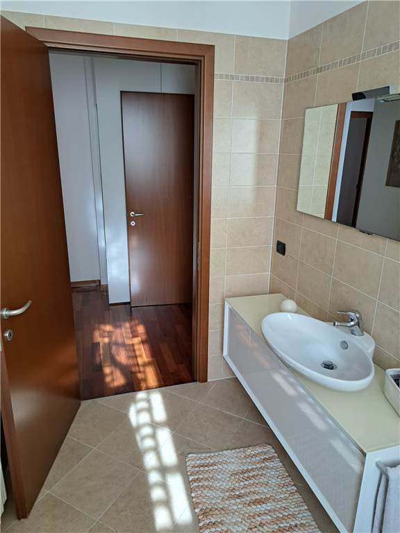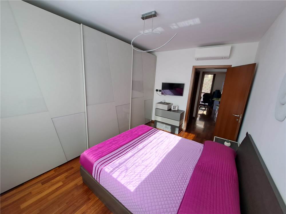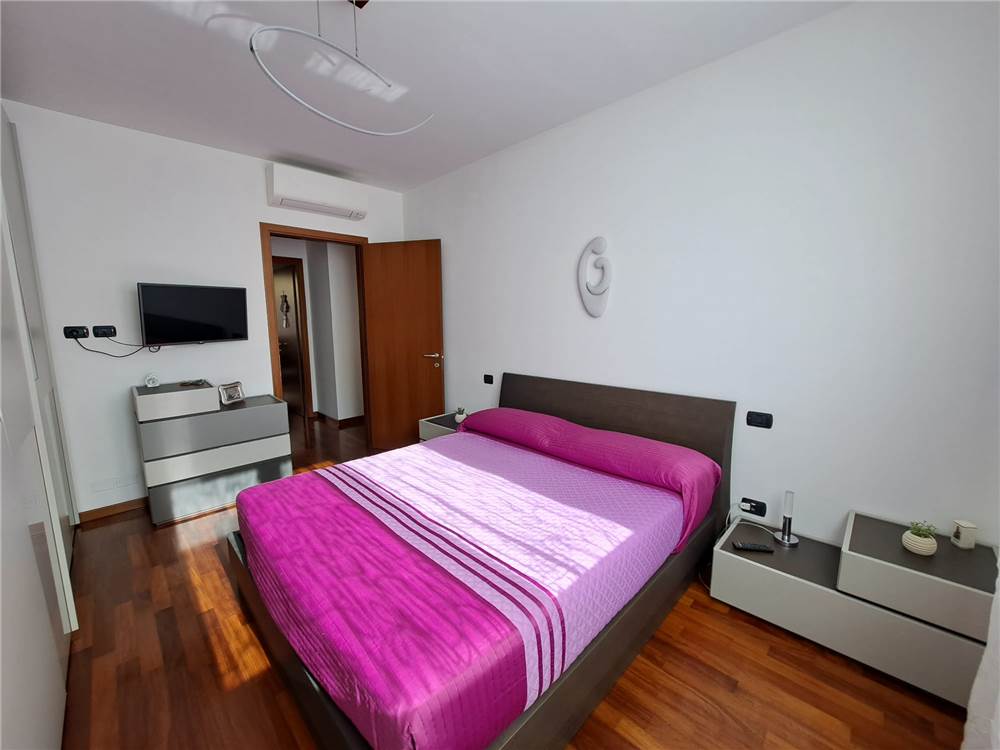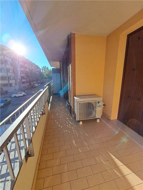 ingresso , soggiorno con cucina a vista e uscita su ampia balconata, anticamera notto, camera matrimoniale, cameretta , doppi servizi, cantina e box. L'appartamento gode di infissi in doppio vetro e aria condizionata .